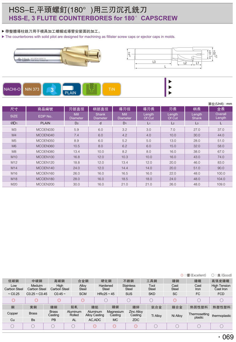 1. 直柄公制沉頭銑刀069
