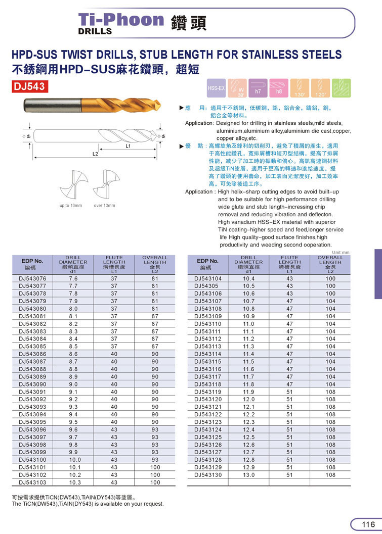 4. HSSCO鍍鈦不銹鋼鑽頭113