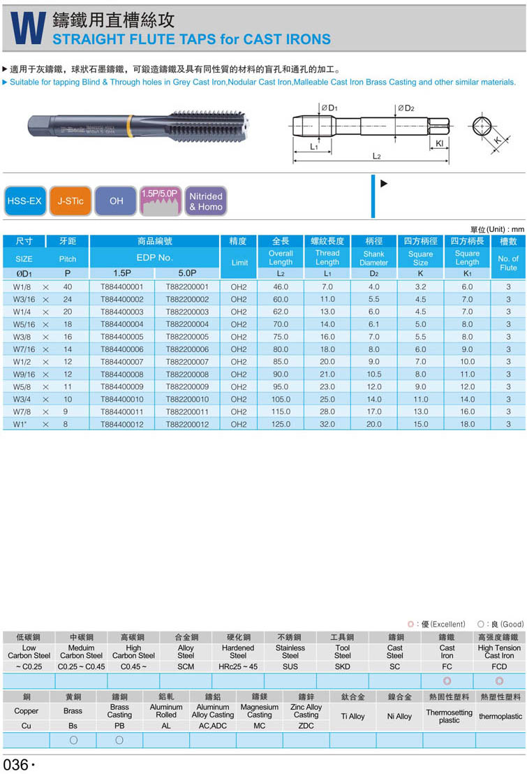 英制鑄鐵直槽機用絲攻032