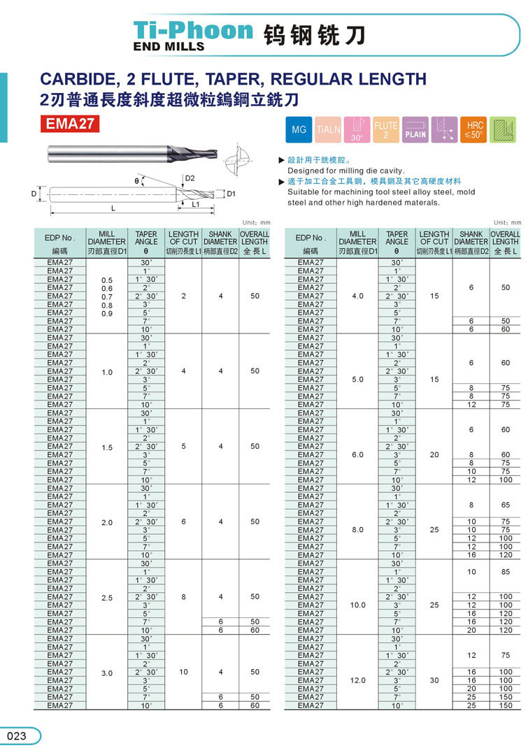 2刃超微粒鎢鋼斜度立銑刀024