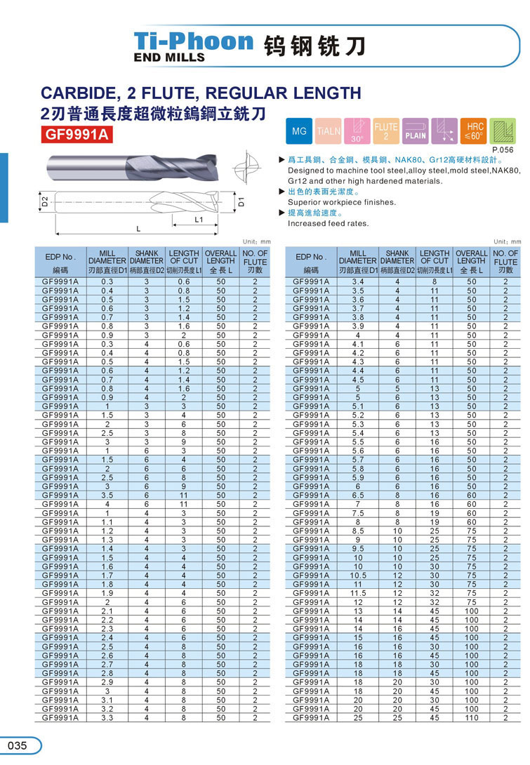 1. 2刃超微粒鎢鋼立銑刀035